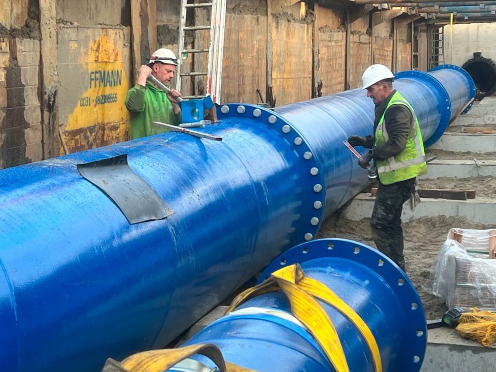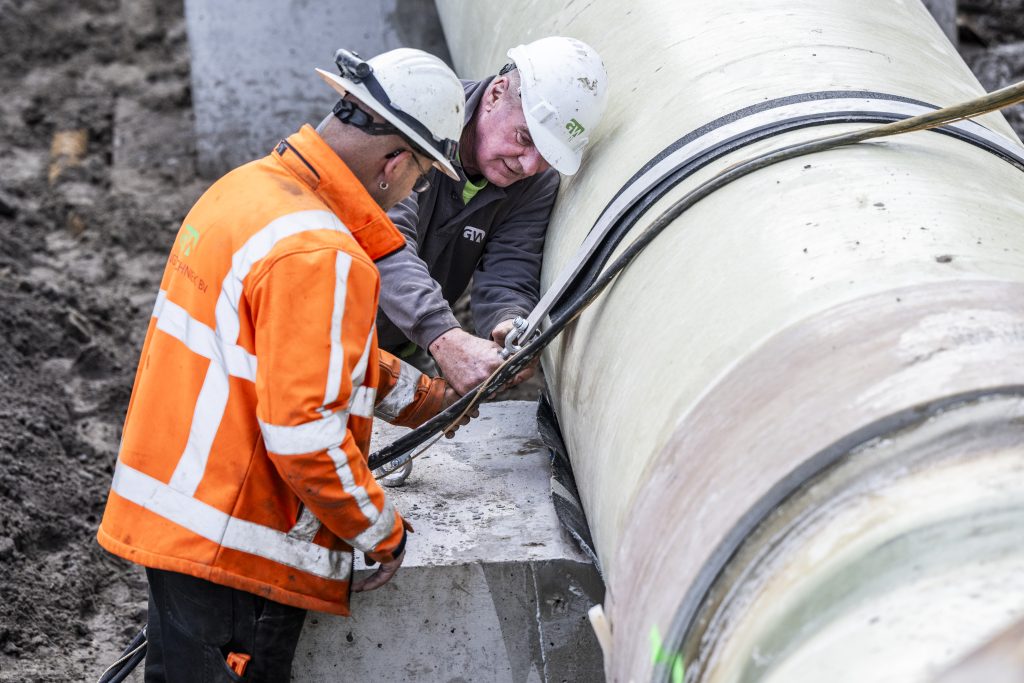 Momenteel werkt Mark aan een project in Delft. Hij legt hier samen met zijn collega John een waterleiding aan voor een pompstation. ‘Onze leverancier heeft eerst sleuven gemaakt. Met een grote boor gaan ze wel 18 meter de grond in. We gaan een leiding leggen van 500 meter lang. Onze buis heeft een doorsnee van zo’n 80 centimeter’. Een typische klus voor ons? ‘De projecten die ik doe zijn heel verschillenden, dat maakt mijn werk zo leuk. De ene keer werk ik, zoals nu, in de bebouwde wereld. De andere keer sta ik in de weilanden. We leggen waterleidingen, rioolleidingen maar ook blusleidingen voor de brandweer.