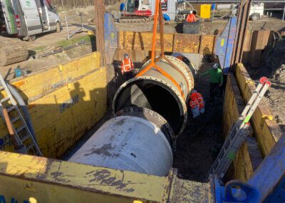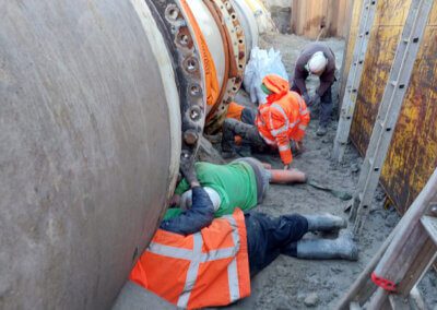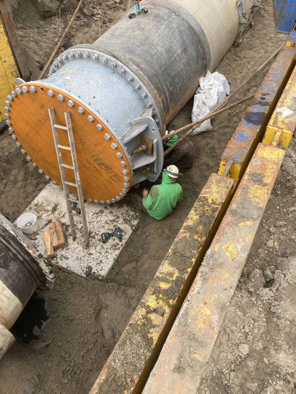 Op donderdag 2 februari was eindelijk de grote dag. Onze mensen hebben de inkomende leiding (2000) tijdelijk dichtgezet om deze te onderbreken. Het onderbreken van de leiding is uitgevoerd door het pendelstuk te verwijderen en een Ø 2000 ff-stuk inclusief blindplaat te monteren. Om de krachten op het ff-stuk op te vragen is een damwandcontructie met trekstanden aangebracht.