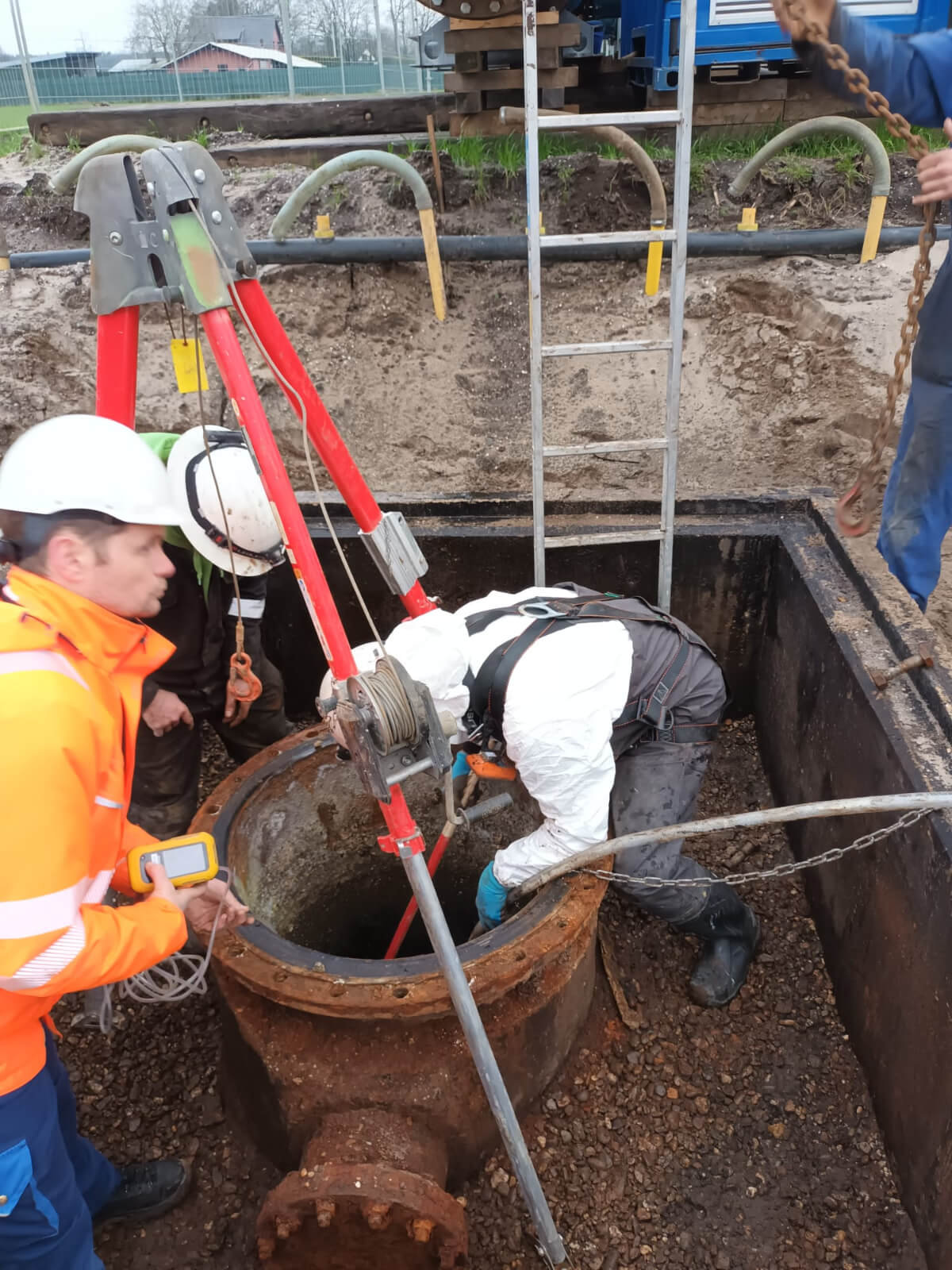 Vanwege de regen was het op de dag na de relining niet mogelijk om de TPI af te sluiten en de GVK leiding in te bouwen in de betonbuis. Deze dag werd gebruikt om het grootste deel van de leiding te sluiten en de voorbereidingen te treffen voor de inbouwwerkzaamheden. Het groene licht om de werkzaamheden uit te voeren ontvingen we op vrijdagmiddag. Dankzij de flexibiliteit van ons team was het geen probleem om mensen te mobiliseren voor het weekendwerk.