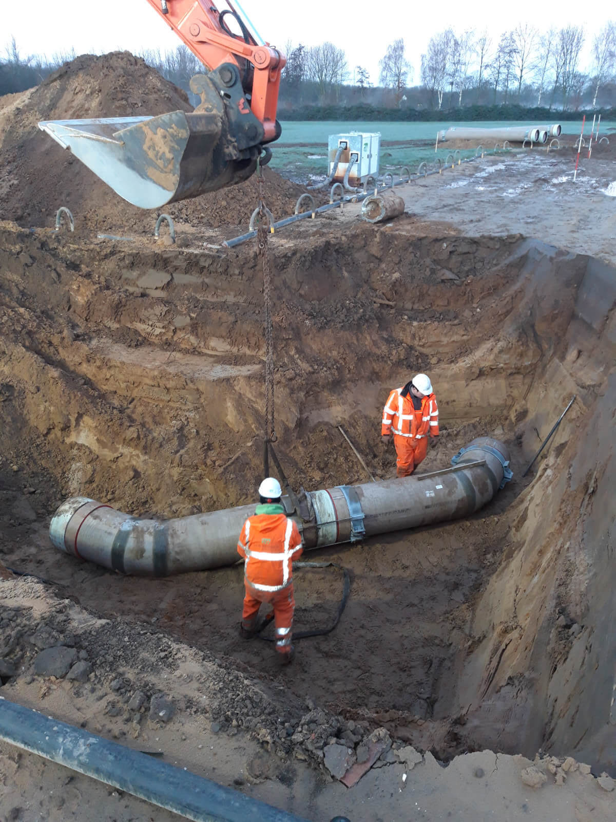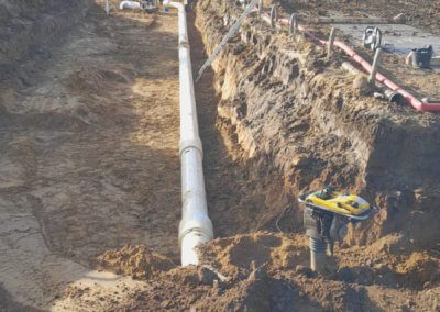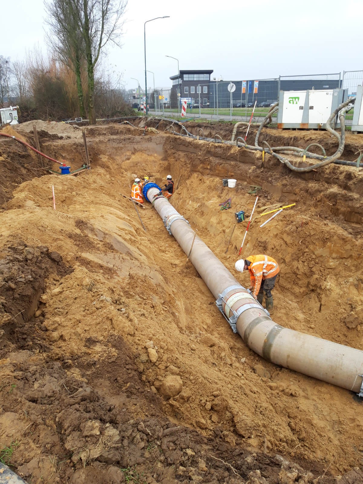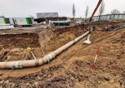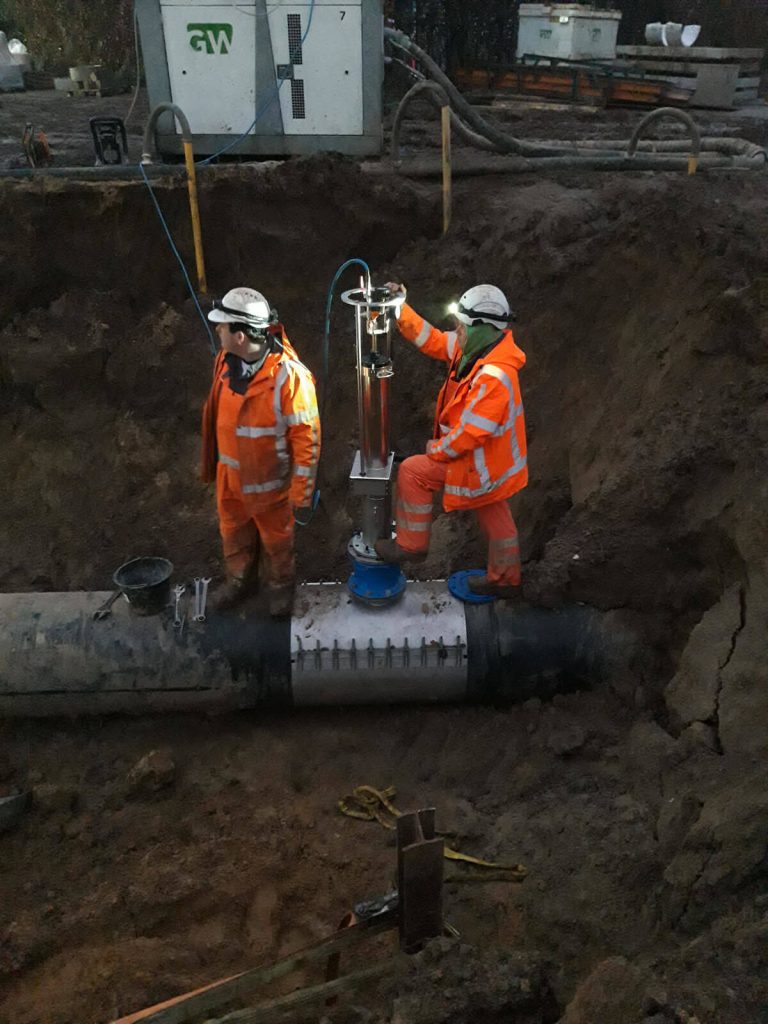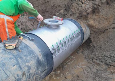 De eerste stap was het aanbrengen van de bemaling en het aanleggen van de nieuwe GVK leiding. Deze leiding is vervolgens beproefd op 6 bar. Hierna startte het inbouwen van de nieuwe leidingen op de bestaande AC leidingen. Hiervoor zijn twee aanboringen onder druk gemaakt. Hierbij werd een RVS aanboorzadel geplaatst op de leiding, welke we voor het aanboren altijd testen op waterdichtheid. Via de aanboringen werden op de inbouwdag twee blazen (‘ballonnen’) in de leiding gezet, die ervoor zorgen dat het te vervangen leidingdeel wordt ingeblokt. Hierdoor kon alleen het ingeblokte leidingdeel worden leeg gepompt en niet de gehele persleiding van 5,5 kilometer. Dat scheelt uren pompen en dus enorm veel tijd.
