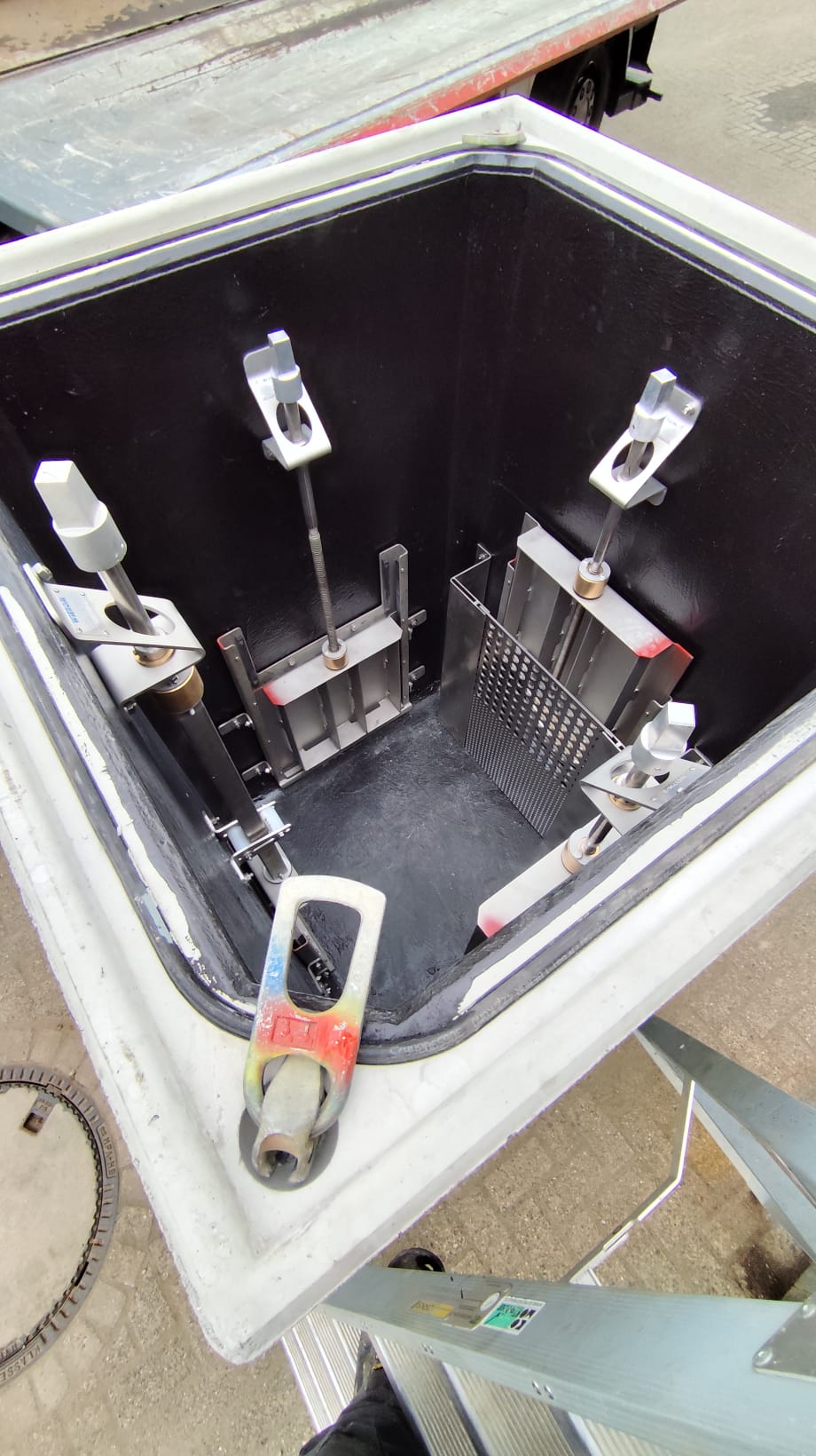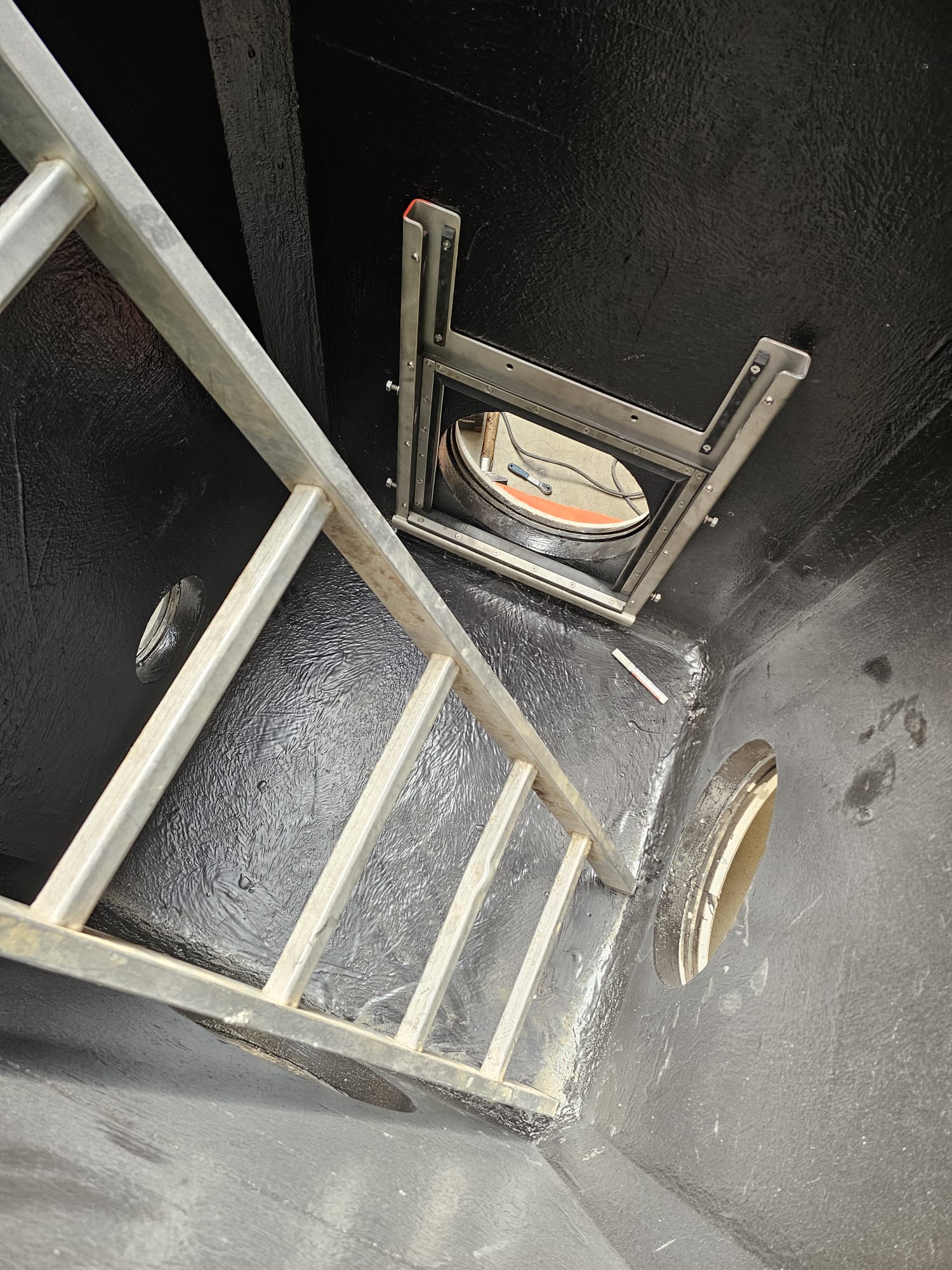 Eerder mochten we op dit terrein al een pompput vervangen. Deze keer betrof het de verdeelput die vóór de pompput is geplaatst. De betonnen verdeelput is voorzien van een beschermende coating. De componenten zijn volledig in RVS uitgevoerd: 4 schuifafsluiters (3× Ø400 mm en 1× Ø200 mm) en een RVS-zeef. Hiermee hebben wij de wens van de opdrachtgever gerealiseerd: een duurzame, hoogwaardige en toekomstbestendige oplossing met oog voor uitvoering en functionaliteit. De geplaatste zeef zorgt ervoor dat pulp en afval de pompput niet binnenkomen.